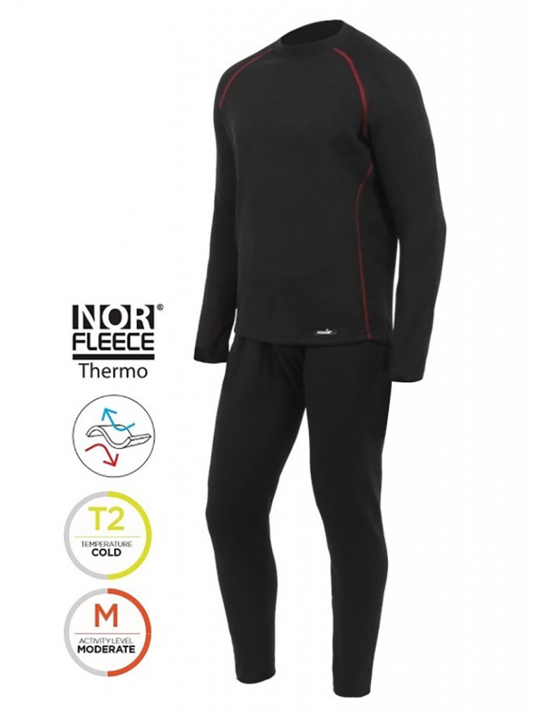 Теплое термобелье из микрофлиса ворсом внутрь. Ворс хорошо отводит влагу от тела, создает воздушную прослойку и сохраняет тепло. Прорезь под большой палец позволяет зафиксировать удлиненный рукав и спрятать в нем кисть руки. Эластичные манжеты на рукавах и штанах обеспечивают плотное прилегание белья к телу и сохранение тепла тела.