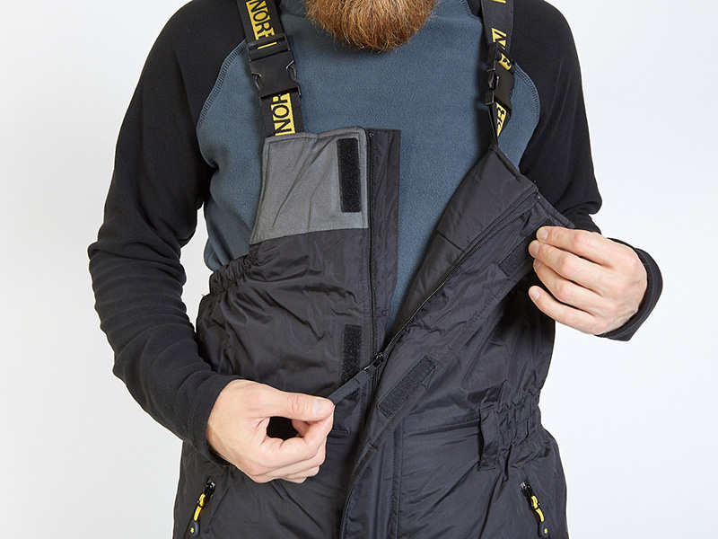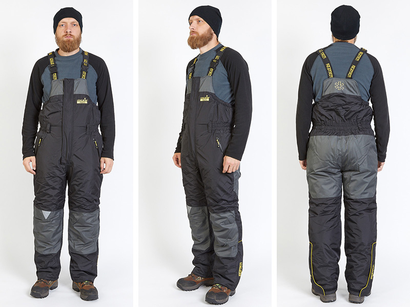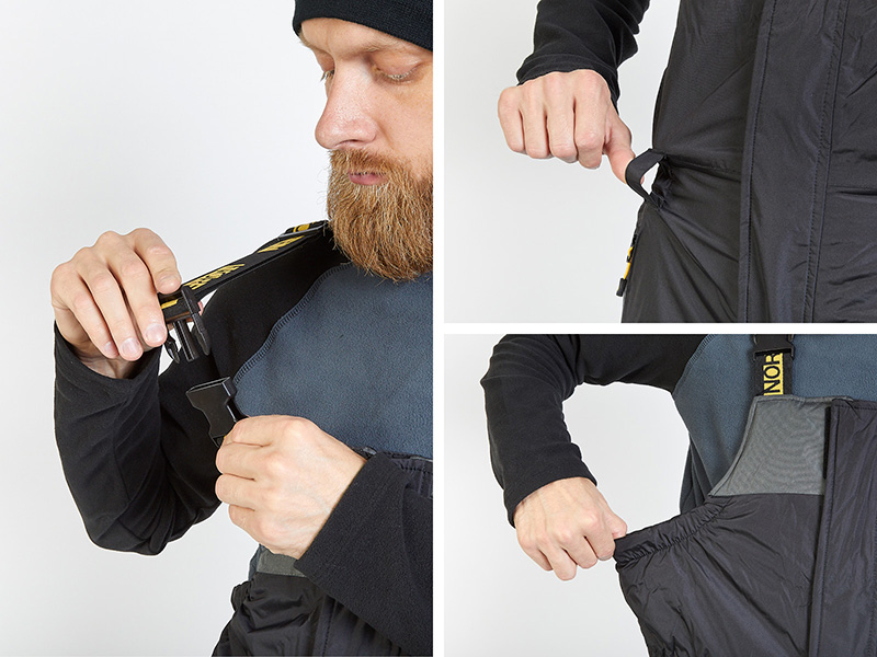 Эластичные лямки комбинезона имеют регулировку по длине и оснащены застежками типа «фастекс». Высокая спинка брюк имеет эластичные стяжки в области груди и поясницы. Так же в области пояса предусмотрены лямки для использования ремня.