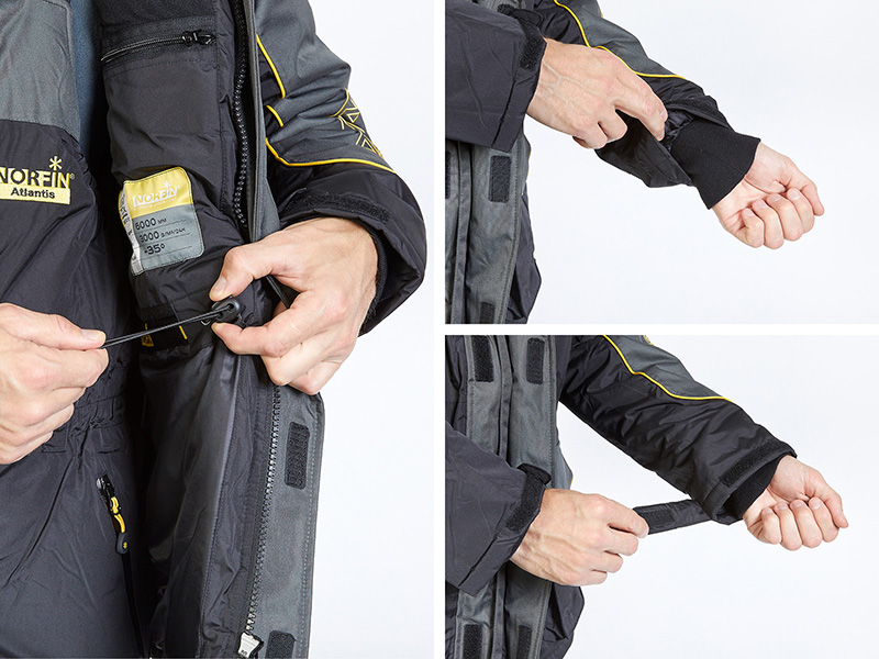 Манжеты рукава имеют внутренний клапан из текстильной ткани. С внешней стороны оснащены фиксаторами с застежками Velcro, в области пояса имеется эластичная стяжка с фиксаторами.