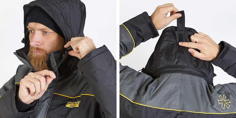 Куртка имеет высокий воротник и отстегивающийся капюшон. Капюшон куртки оснащен эластичной стяжкой с фиксаторами в области лица, а также регулировкой по объему на застежке Velcro.