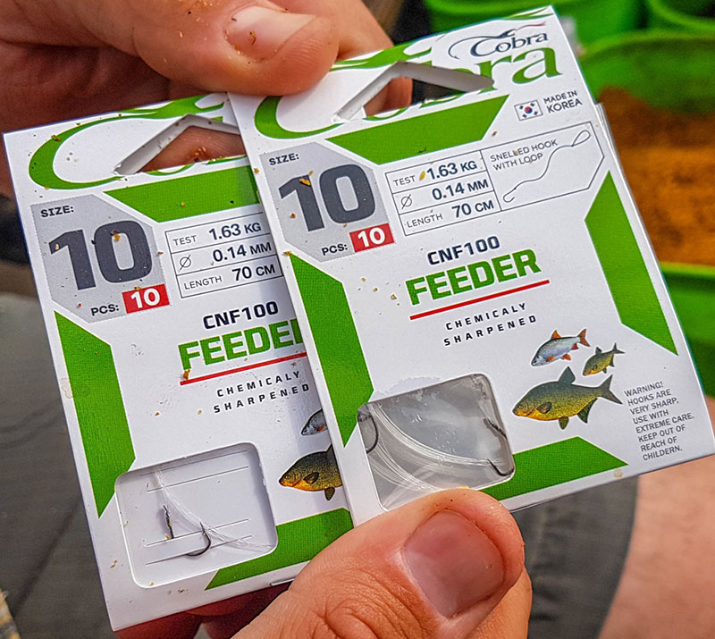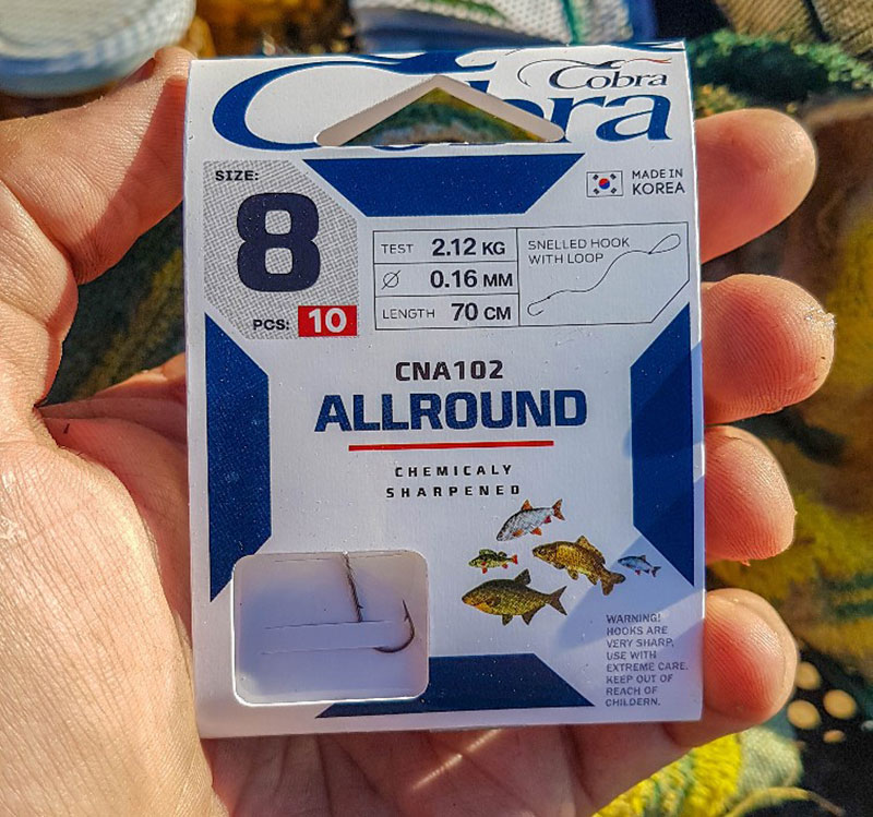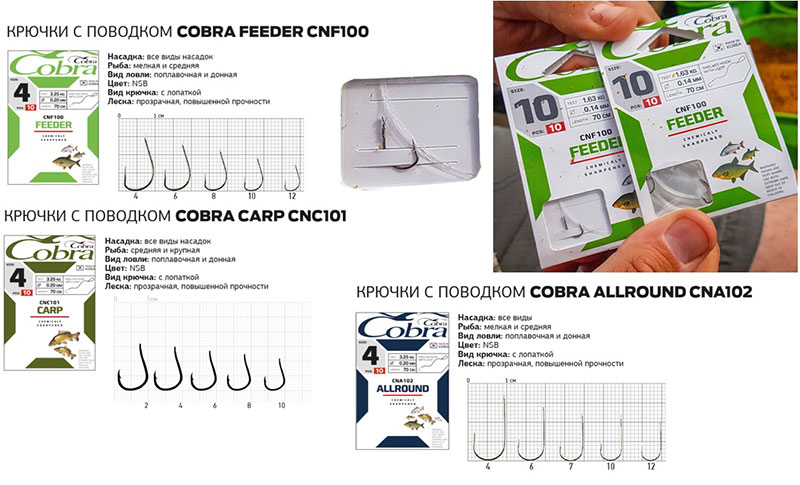 Отдельно стоит обратить внимание на линейку крючков, которые идут в продажу готовым монтажом с поводком из монофильной лески. Такое решение очень удобно для любительской ловли на фидер и поплавок в самых разных вариантах и под самые разные виды рыбы. Крючки Cobra с поводком так же поставляются в трех сериях — Allround, Feeder и Carp.