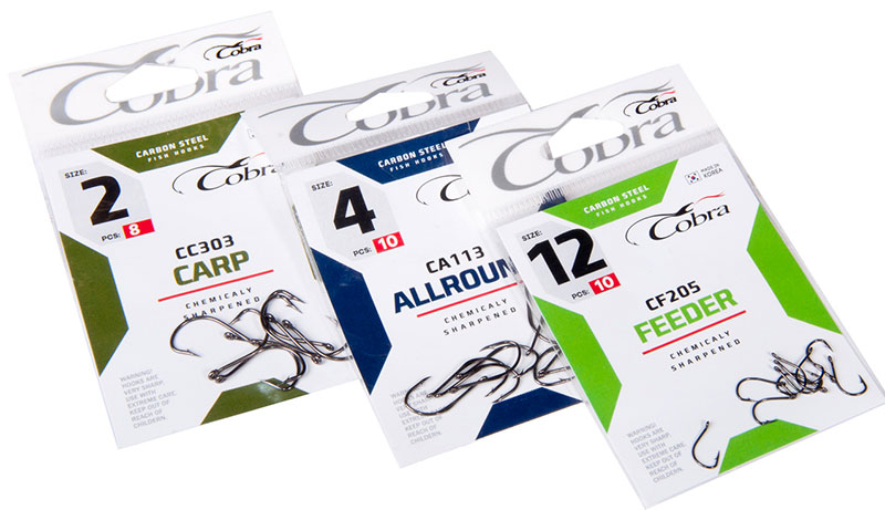 Carp. Для поклонников карпфишинга бренд Cobra выпустил линейку специальных крючков для ловли трофейной рыбы. В зависимости от используемых приманок, рыболов может выбрать различные модели крючков этой серии для насаживания приманки на жало или для изготовления волосяной оснастки. Крючки серии Carp выпускаются в широком ассортименте размеров, что находит применение в фидерной ловле с различными монтажами. В качестве материала использована высококачественная стальная проволока. Тефлоновое покрытие надежно защищает изделие от коррозии.