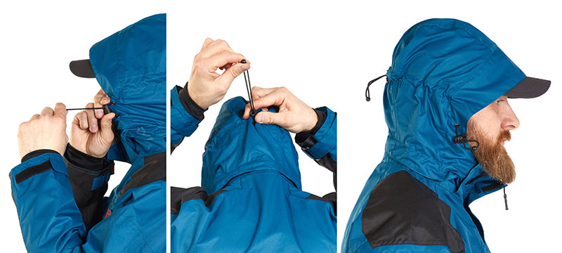 Капюшон имеет анатомичный крой и двухуровневую регулировку по объему, что позволяет точно подогнать его под размер головы. Передние части капюшона крепятся к воротнику куртки в специальных кармашках при помощи липучек «Velcro». Такое крепление делает соединение капюшона с курткой очень практичным, капюшон не выглядит как отдельное звено.