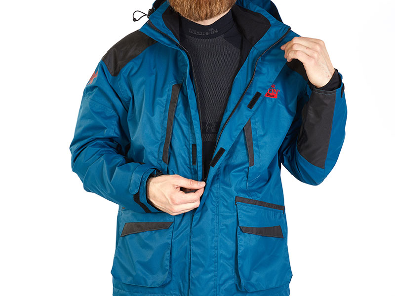 Передняя застежка-молния закрывается ветрозащитной планкой. Для надежной фиксации верхняя часть планки фиксируется кнопочным соединением.