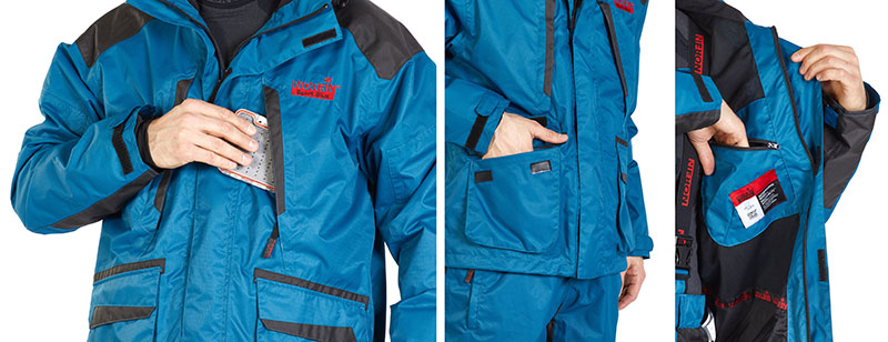У куртки четыре внешних кармана: два боковых с ветрозащитными клапанами на липучках «Velcro» и два объемных нагрудных кармана на молниях, а так же один, внутренний карман, на молнии для документов, мобильного телефона и прочих важных мелочей.