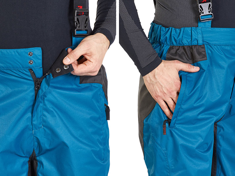 Имеют свободный крой. Для комфорта в использовании, а так же для защиты области поясницы от ветра, брюки выполнены в форме полукомбинезона, с регулируемыми эластичными лямками на застежках типа «фастекс». При необходимости лямки и спинку брюк можно отстегнуть.