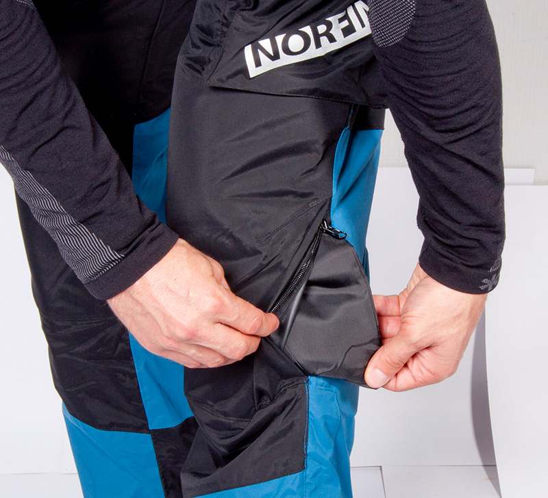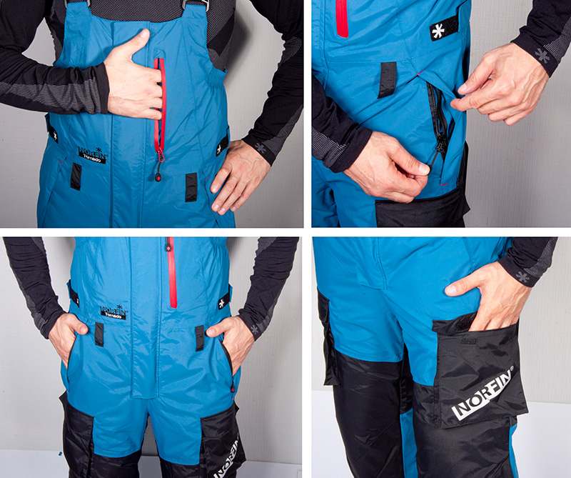 Брюки имеют один внутренний нагрудный карман на влагозащитной молнии YKK ®, два поясных кармана на молниях, а так же два накладных кармана в области бедер на липучках Velcro.