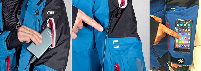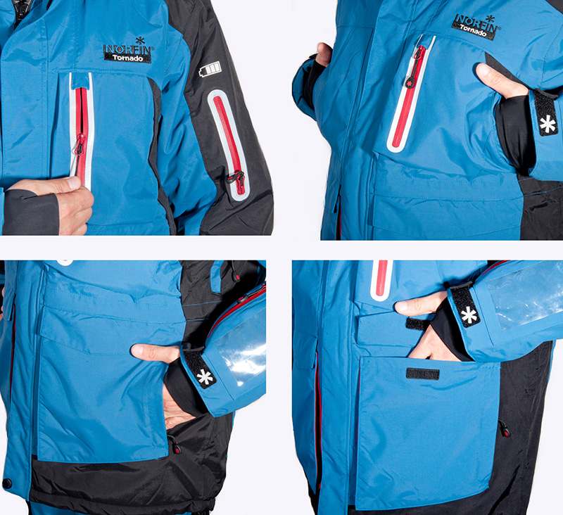 Два кармана с влагозащитой на рукаве куртки для использования мобильного устройства в связке с АКБ и зимним беспроводным эхолотом. Карман для смартфона имеет прозрачную часть с чувствительной поверхностью, которая позволяет пользоваться устройством, не вынимая его из кармана.