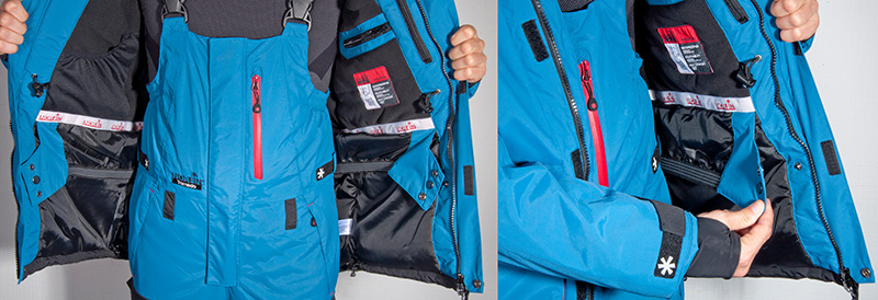 Имеет 9 внешних карманов. Два нагрудных кармана с мягкой микрофлисовой подкладкой отлично подходят как для отогревания рук, так и для различных необходимых мелочей. Два внешних сдвоенных кармана на молниях и застежках Velcro. Один нагрудный карман на влагозащитной молнии YKK ® для необходимых мелочей.
