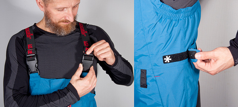 Эластичные лямки комбинезона имеют регулировку по длине и оснащены застежками типа «фастекс». Высокая спинка брюк имеет эластичные стяжки в области подмышек и регулировочные стяжки на застежках Velcro, в области пояса. Так же в области пояса предусмотрены лямки для использования ремня.