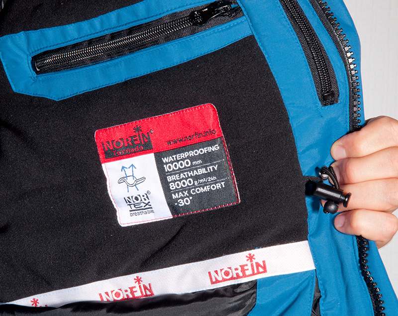 Внешняя ткань костюма – мембрана NORTEX BREATHABLE®. Паропроницаемость: 8000 г/м²/24час, водонепроницаемость: 10000 мм.