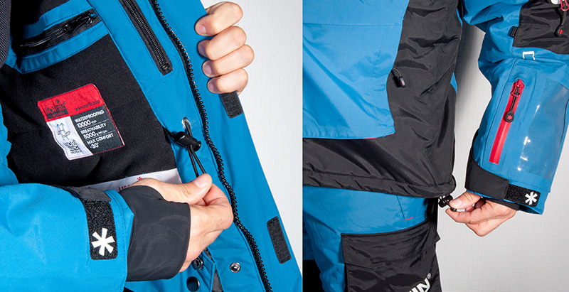 Манжеты рукава имеют внутренний клапан из эластичной ткани с прорезями для пальцев. С внешней стороны оснащены фиксаторами с застежками Velcro.