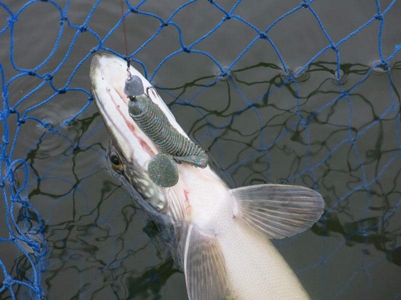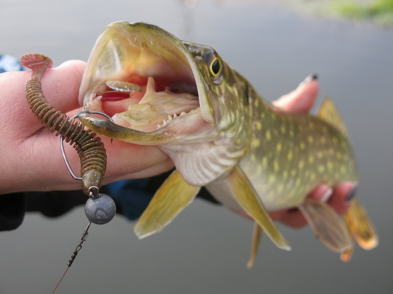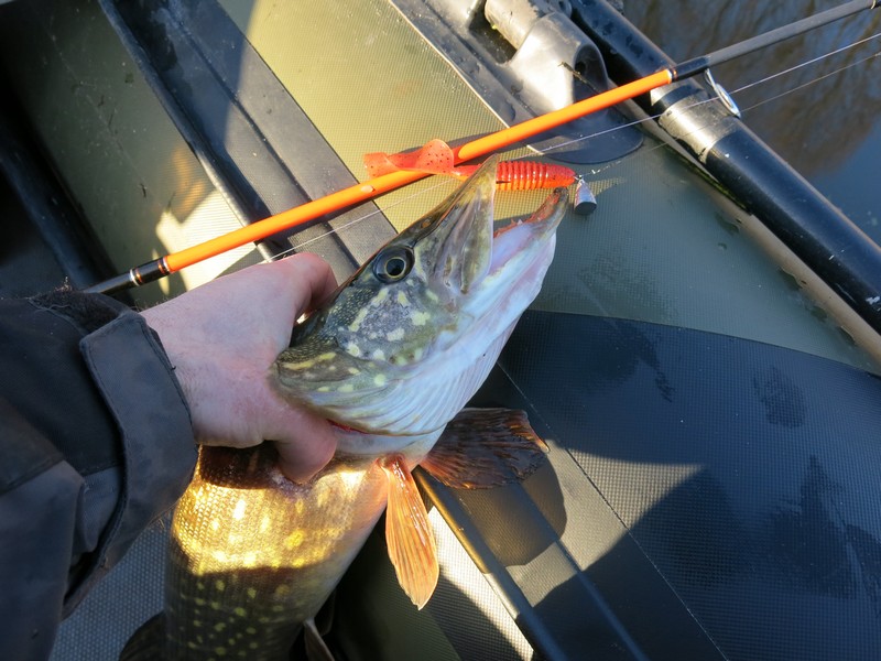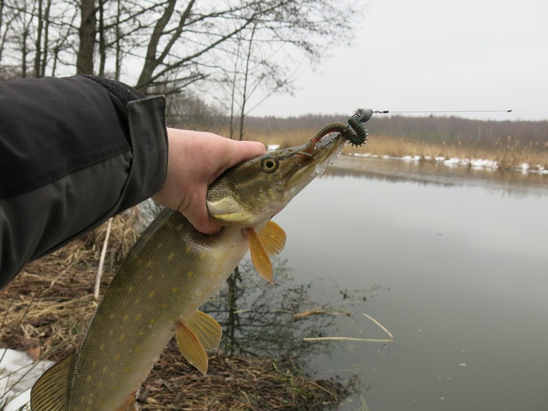 Но по-настоящему раскрылась приманка в щучьем джиге осенью и зимой на реке. Сначала я половил на речке с берега, и большинство поклевок было на Spark Tail 4.