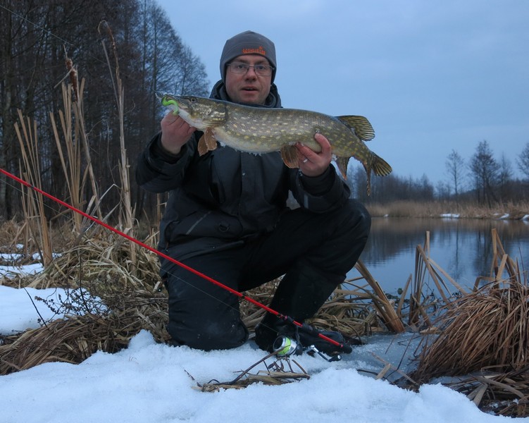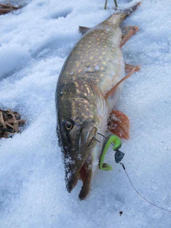 На нее еще в самом начале сезона – 28 февраля – была поймана хищница около 3,5 кг весом – с берега на реке, а через месяц – первая щука с лодки.