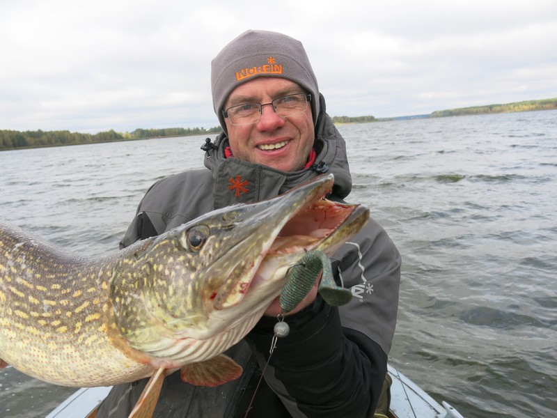 Дело было 6 октября на одном из щучьих водохранилищ, где тактика ловли представляет собой облавливание русловых ям затопленной реки. Проводка стандартная ступенчатая, и на одной из пауз, уже на выходе из ямы, последовала четкая поклевка. Оснащен Joco Shaker был на двойном крючке с чебурашкой 14 г. Сработал один из моих любимых цветов F08 Pione.