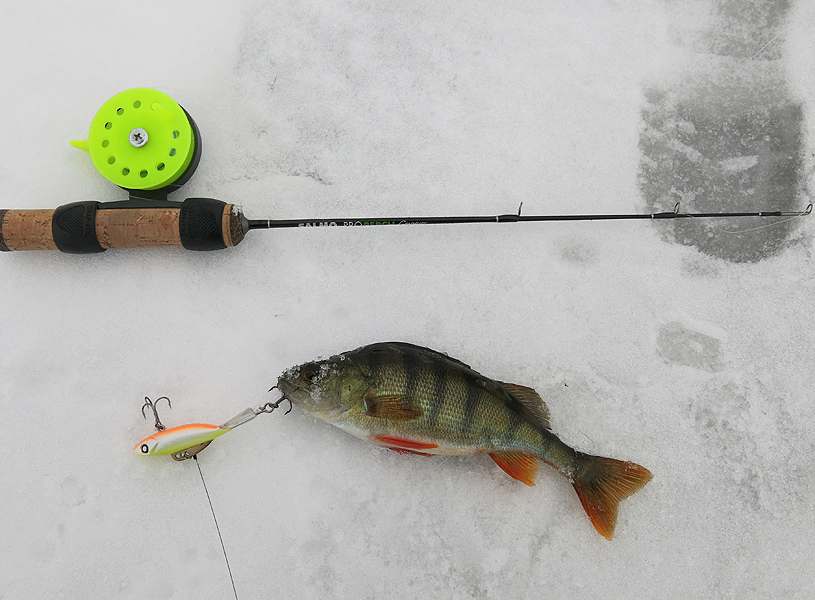 213. Желто-бело-оранжевая. Щучья поклевка была быстрой, но нереализованной – хищница сошла прямо в лунке. Подумал – лиха беда начало, но дальше зубастая эту расцветку игнорировала. У напарника история еще интереснее – неплохая по ощущениям щука во время вываживания расстегнула карабин и ушла вместе с приманкой. Упираясь в 213-й цвет как следует, все-таки разловил его окунем.