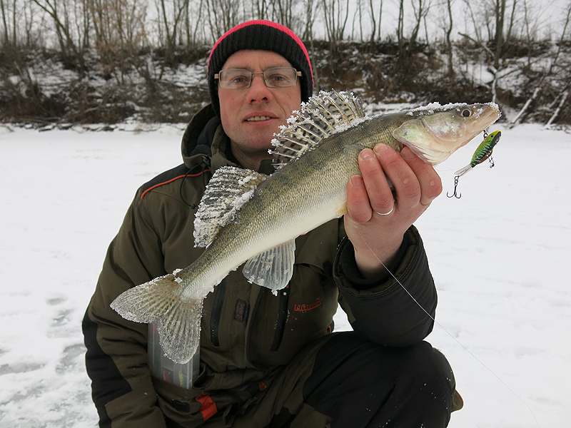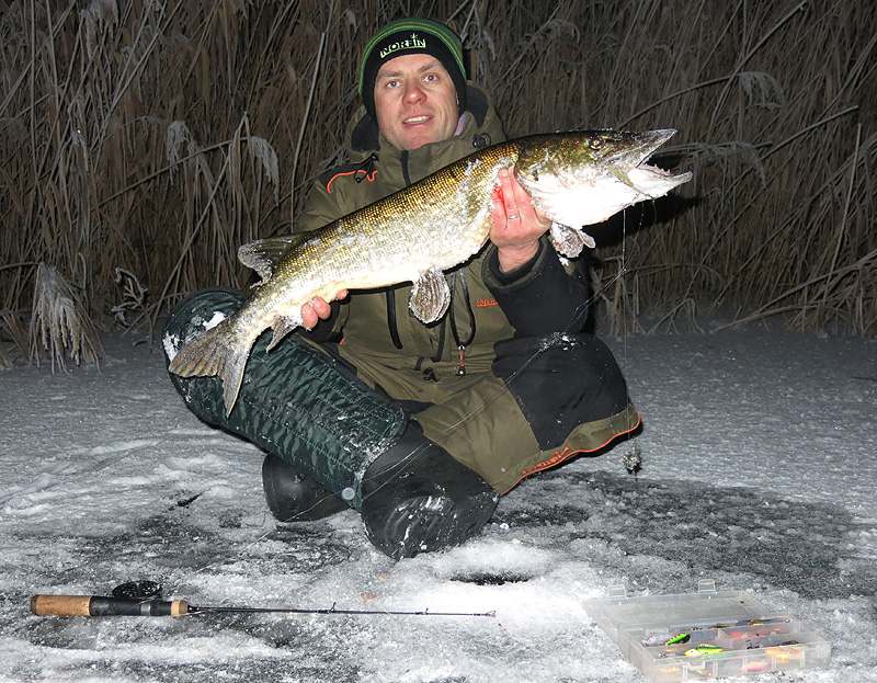 305. Еще один заведомо перспективный цвет, с него в январе 2014-го и начался отсчет «мебарных» щук. Но этой зимой по хищнице у меня почему-то он не выделился. Хотя Юра почти в темноте взял на него абсолютный рекорд – 6860 г. Я с разных типов водоемов поймал на него 3 щучки, плюс было пару видимых сходов уже под лункой. Самая крупная – «околокилошка» – клюнула на водохранилище Локтыши при целенаправленной ловле окуня на 57-й размер балансира. Пару окуней до этого тоже было, но щука порадовала больше. Немного разочаровал он в вечерних сумерках, когда кислотнику положено было ловить (можно вспомнить трофейный пример моего напарника Юры) – ставил его часто, но, если не ошибаюсь, вечером была всего одна поклевка с быстрым сходом. Если бы хит-парад был не щучьим, можно было поставить кислотный 305-й местом повыше, так как кроме окуней я поймал на него единственного зимнего судака – на Днепре 14 февраля. По клыкастому этот цвет мне особо рекомендовали, но будем это проверять уже следующей зимой.