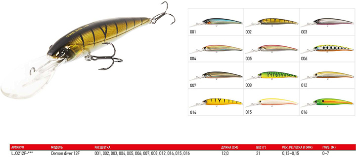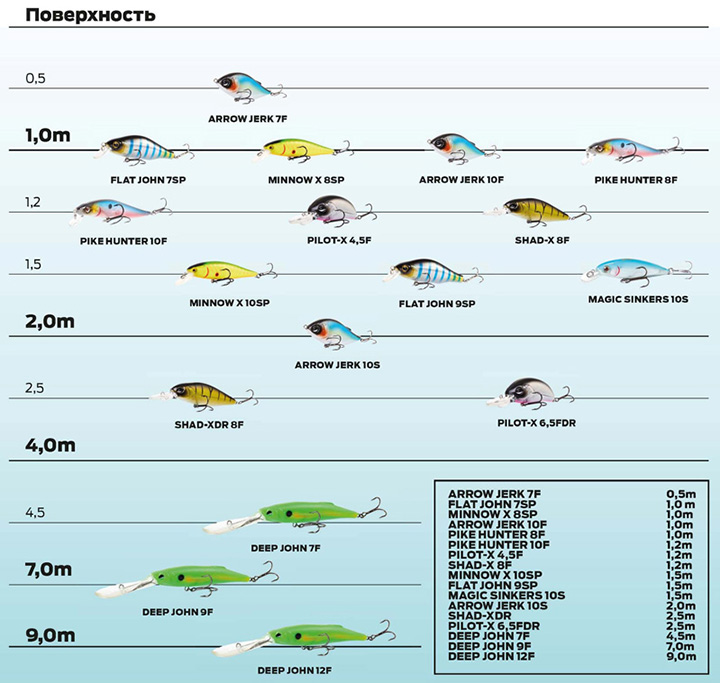 Плавающий глубоководный воблер, способный за короткую дистанцию проводки достичь максимальной глубины до 9 метров. Только эта приманка позволит поймать крупную рыбу, обитающую в придонном слое. Используются при ловле взаброс и для троллинга. Встроенная «погремушка» привлекает хищную рыбу в воде с недостаточной прозрачностью и за счет перемещения металлических шариков позволяет увеличить дальность заброса на 20%. Выпускается в трех размерах – 70, 90 и 120 мм.