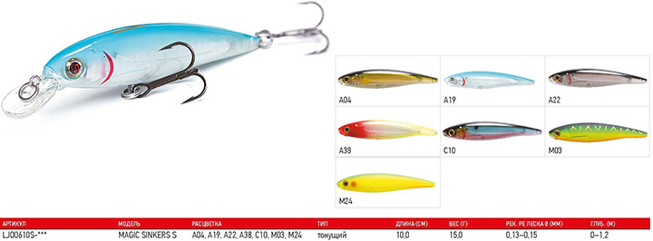 Тонущий воблер разрабатывался специально для твичинга – при такой проводке его игра раскрывается максимально ярко. Приманка имитирует движения небольшой рыбки, скрывающейся от опасности. Собственная игра приманки – не слишком размашистая, с довольно большой частотой. Воблер наиболее эффективен при ловле хищной рыбы на глубинах до 3 метров. Обладает отличными полетными качествами и привлекательным шумовым эффектом.