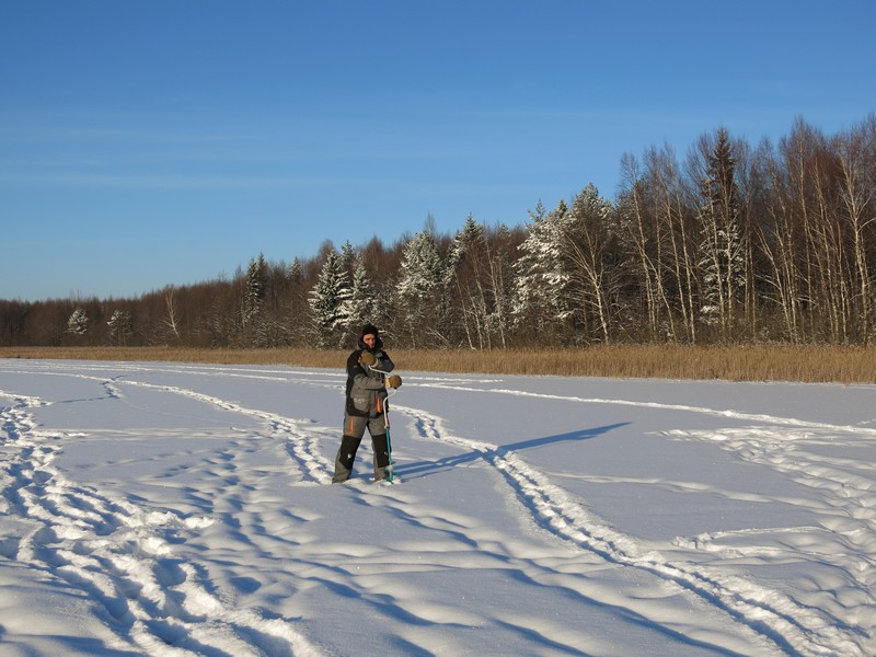 Глубина у кромки растительности не должна быть слишком маленькой – ловить в таких местах хорошо лишь по тонкому первому льду. Точно определить ее удается не сразу, а только облавливая непрерывный ряд лунок, просверленный непосредственно вблизи растительности. Во время проверки лунок отмечаю участки поглубже – обычно это 1,5-2,5 м. Запоминаю их либо визуально, по каким-то береговым ориентирам, либо забиваю в навигатор. Уже после первой рыбалки можно сориентироваться, какие озерные участки являются более перспективными для ловли, а какие лучше пропустить.