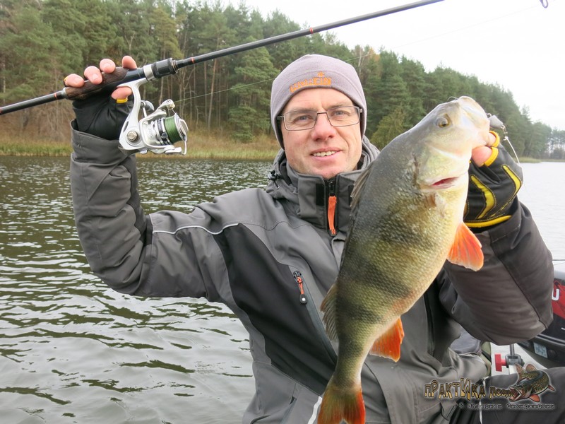 Рыбалка 19 ноября в очередной раз убедила, что крупного окуня много не бывает! Если правильно настроиться, то 1-2 окуня за рыбалку уже не огорчают – это обычное для трофейной рыбалки явление. В этот раз шли по наработанному маршруту – сперва проверили русло – безрезультатно, затем твердые бровки, и к 10 утра снова оказались на уже знакомом коряжнике. Протягиваю очередное валяющее на дне дерево, и когда оно должно было закончиться, приманка почему-то на дно не падает. Делаю контрольную подсечку и понимаю, что, скорее, всего, это рыба. Даже несколько раз перепроверял – такая неожиданная была поклевка. В результате подвел к лодке своего рекордного окуня – при длине 48 см он завесил 1,65 кг. Сработал "лакиджоновский" Spark Tail 3,8 из старых запасов в цвете 006.