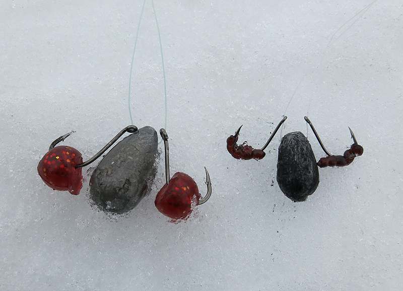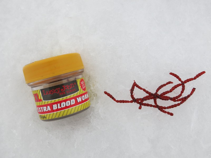 Первое время оснащал крючки балды кусочками различных красных твистеров. Почему именно такого цвета? Вероятно по аналогии с мотылем – основной зимней наживкой. Потом товарищ посоветовал попробовать искусственного мотыля – в то время таковой как раз вышел в ассортименте Lucky John. По сути это была зимняя мягкая резина под названием Extra Blood Worm, очень натурально имитирующая личинку комара-звонца, то есть обычного мотыля, и по запаху напоминающая «летнюю» съедобку. Стал использовать и ее, вместе с кусочками обычных мягких приманок. Заметил, что на пустых поклевках окунь иногда стягивает такую насадку – то есть можно предположить, что он воспринимает ее как пищевой объект.