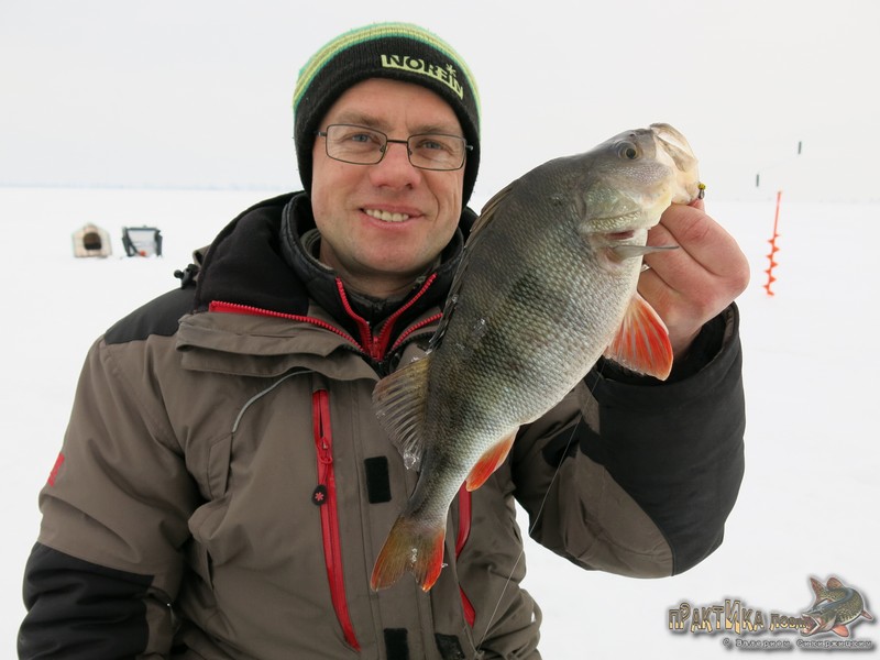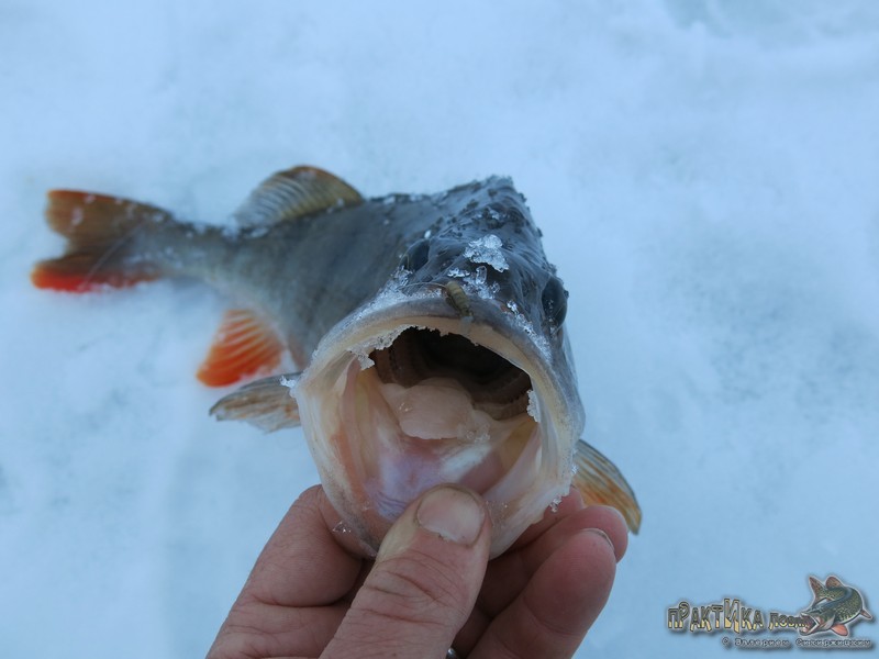 Основных «разведчиц»-мормышек по-прежнему две: «банан-бокоплав» и «нимфа». Чтобы мормышки не перевязывать на льду, чередую сами удочки. Первые поклевки на «банан» закончились двумя сходами, одного неплохо окуня удалось даже «погладить» прямо в лунке. Причины сходов становятся ясны после смены мормышки на «нимфу» – из «отдохнувшей» лунки удается все-таки выловить парочку полосатых, которые отцепляются от крючка, как только попадают на лед – выходит, засекаются очень аккуратно, поэтому форсировать вываживание не стоит. Один из окуней по весу уже явно больше полкилограмма, что не может не обнадеживать.