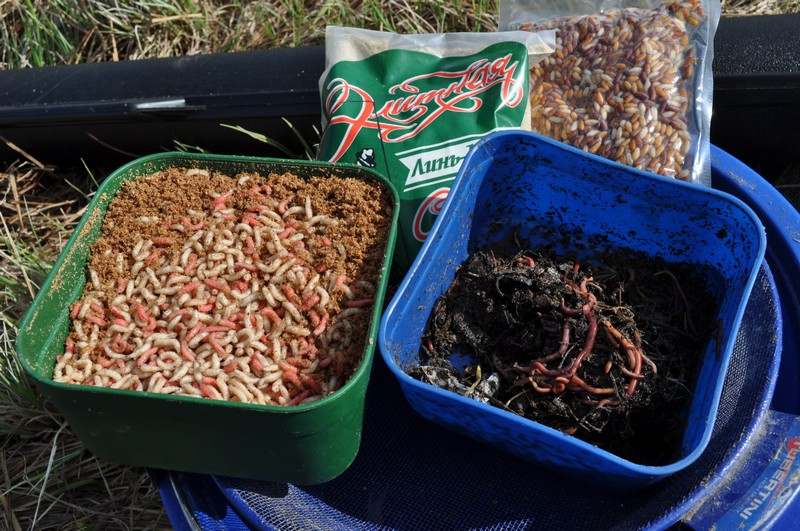 Линь всеяден. Однако львиную долю его рациона составляют улитки, пиявки, черви и личинки насекомых. Набор наиболее часто используемых приманок, которым я пользовался на этих рыбалках, состоял из окрашенных в красный цвет опарышей, кастеров, навозных червей, теста из манки и консервированной кукурузы. Охотно клевала эта рыба и на всевозможные бутерброды: опарыш-червь, опарыш-кастер, червь-кукуруза. Весной, пока вода еще достаточно холодная самой уловистой приманкой оказался красный опарыш. А вот после нереста, особенно в водоемах с большим количеством красноперки, лучше других работают пареные злаки: консервированная кукуруза, горох и перловка.