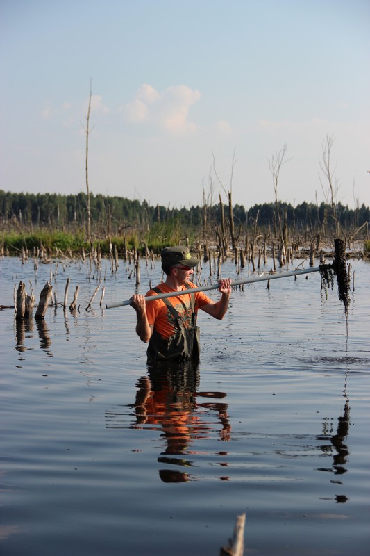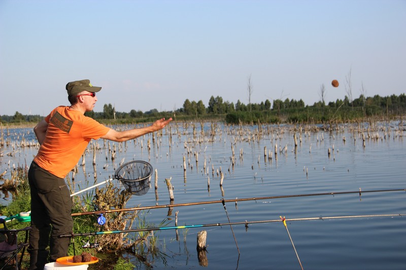Поставив прикорм доходить до требуемой консистенции, приступаю к подготовке точки заброса. Если акватория достаточна для заброса оснастки, крючок не цепляется в траве, проблем нет. Но летом чаще всего дно торфяников затягивается «лианами» растений и «прошить» ковер оснасткой не удается. Поэтому приходиться надевать забродный костюм и заходить в воду с граблями. При их помощи выдираю траву с квадрата размером примерно два на два метра под одну удочку. В него впоследствии и забрасываю прикормочные шары размером с апельсин.