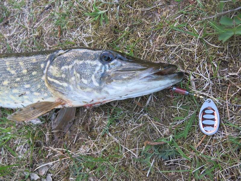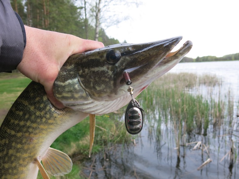На мелководье, ближе к верховью водоема, также удалось поймать с пяток щук. И тоже лучше себя показали именно крупные блесны – приходилось лишь увеличивать скорость проводки и подымать вверх бланк спиннинга. Регулярно вешались на «четверки» и небольшие окуньки.