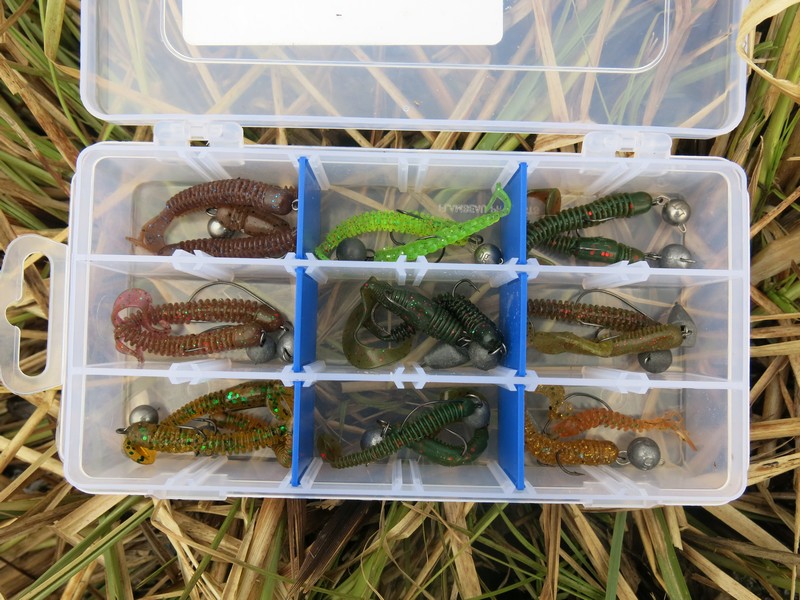 Основная проводка по классике – два оборота и пауза. На остановках можно, а иногда и нужно подыгрывать вершинкой удилища. Ну а далее уже подстраиваемся под условия ловли – можем, например, увеличивать или уменьшать количество оборотов, если глубина меняется, или их скорость. Ну и вес груза, конечно. Стандартные веса, которые я использую на небольших реках – 3-6 г. Редко ставлю меньше, так как под минимальный вес уже и снасть нужна потоньше. О своей снасти скажу чуть позже, сейчас немного о приманках и их оснастке.