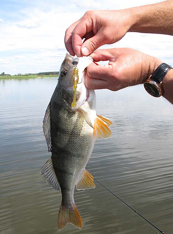 Раньше я считал, что окунь охотнее берет на долгой паузе, то есть при уменьшении веса груза. Так действительно часто происходило по холодной воде. Летом же оказалось наоборот – вдруг стал срабатывать прием увеличения груза, причем чуть ли не в 2 раза. И это для небольших 5-сантиметровых твистеров. На 3,5-4-х метрах проводка получалась достаточно быстрой, с короткими паузами, во время которых окунь все-таки успевал атаковать приманку. Иными словами, менять нужно не только сами приманки, но и вес груза. Причем в любую сторону – какой-то из вариантов может сработать.