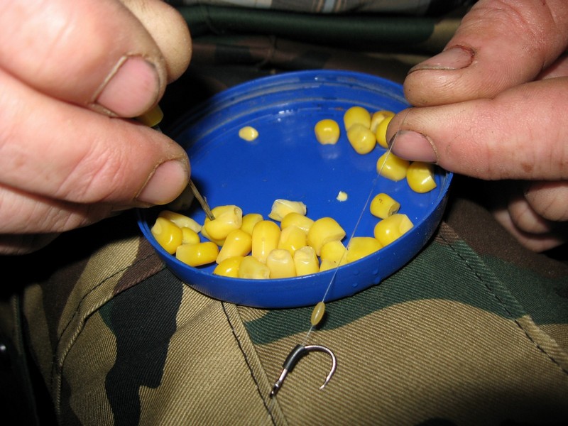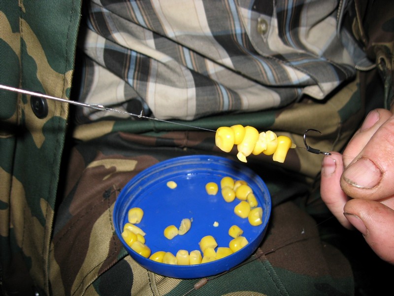 На тех водоемах, в которых обитает не только так называемый «товарный» карп, но и на порядок более крупный, хороший эффект дает использование оснастки, изготовленной по принципу бойловой. Основная разница заключается в том, что вместо бойла на выходящий за крючок отрезок поводковой лески нанизывается гирлянда кукурузы.