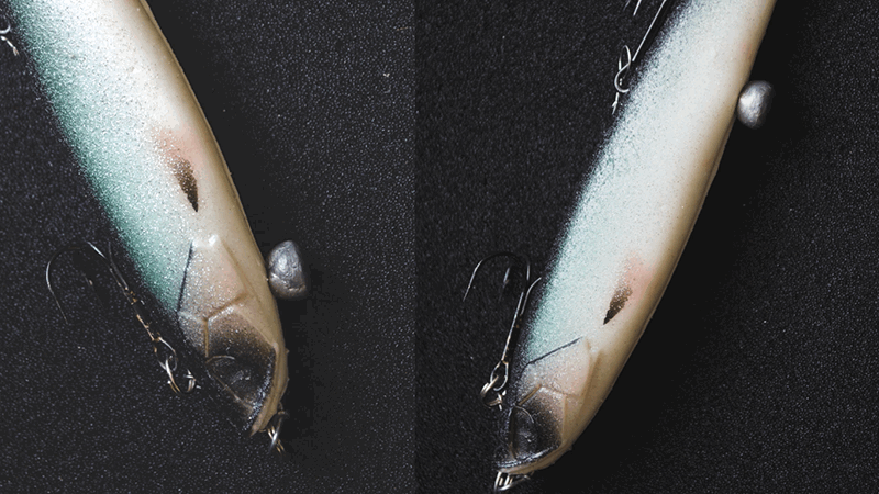 Огрузка в голове делает волнообразную проводку более резкой и джиговой с минимальной подъемной силой. Такой вариант хорош для сравнительно глубоких участков, где имеются резкие свалы или выраженные перепады глубин. В этом случае передняя огрузка позволит четко облизывать рельеф без особого изменения скорости проводки. Особенно этот вариант огрузки актуален в проводках с мели на глубину.