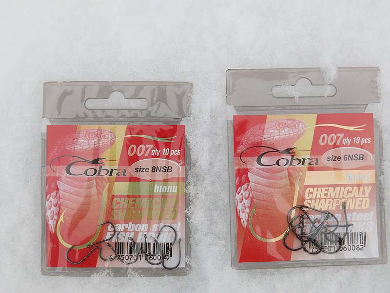 Основными стали приманки в виде капли весом ¼ и 3/8 унции, то есть примерно 7 и 10,5 г. «Родные» крючки купленных в магазине приманок мне показались мелкими для моих трофейных целей и я оснастил каждую балду «своими» одинарниками с широким загибом и ушком для лески. Для этих целей хорошо подошли темные крючки Cobra Hinnu – №6 и №8, а также Cobra Professional Enaga таких же размеров.