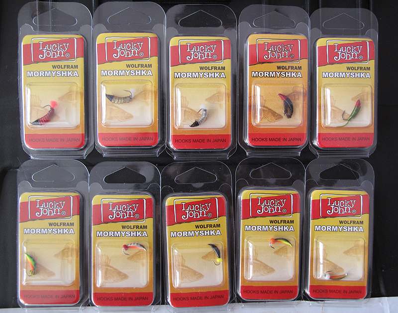 Условно мои безнасадочные мормышки можно разделить на 2 типа. Первый – это приманки, так сказать, самодостаточные, без каких-либо подсадок. На их крючках нет ни бисера, ни кембриков, ни каких-либо других «украшений», а по форме имитируют они чаще всего натуральные объекты, правда, нередко с фантазийными расцветками. Этот набор полностью безнасадочных мормышек представлен у меня в основном моделями под названием «банан» от Lucky John.