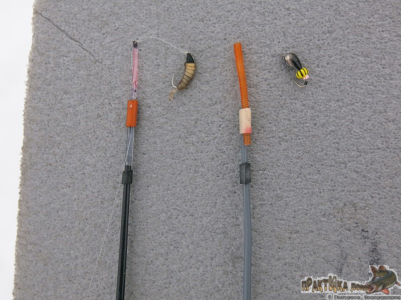 Удочками для ловли на безмотылки у меня являются различные модификации так называемой «балалайки» – она удобно лежит в правой руке, которой я и выполняю проводку. Кивок использую короткий – рабочей длиной 10-15 мм. Он менее подвержен влиянию ветра, да и в целом, еще со времен «спортивного прошлого» к такому привык. Окунь, кстати, после поклевки с резким загибом короткого кивка часто засекается сам. Материал кивка – лавсан или скрученная леска.