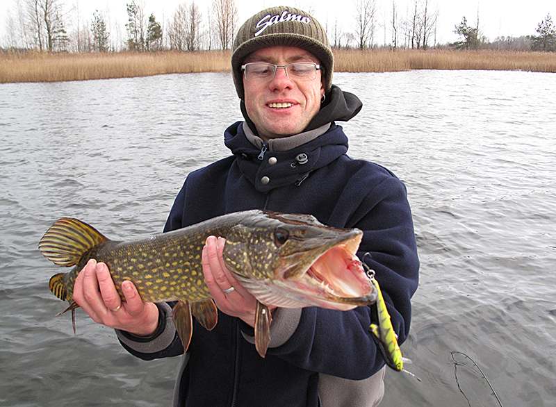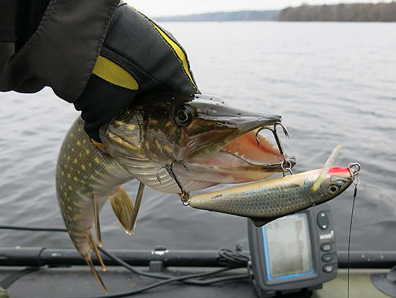 Моим любимым разведчиком осенних мелководий является воблер Salmo Skinner. Раньше чаще ловил на 12-сантиметровую модель, сейчас в основном на «десятку» – она идет помельче и хорошо подходит под заданные условия.