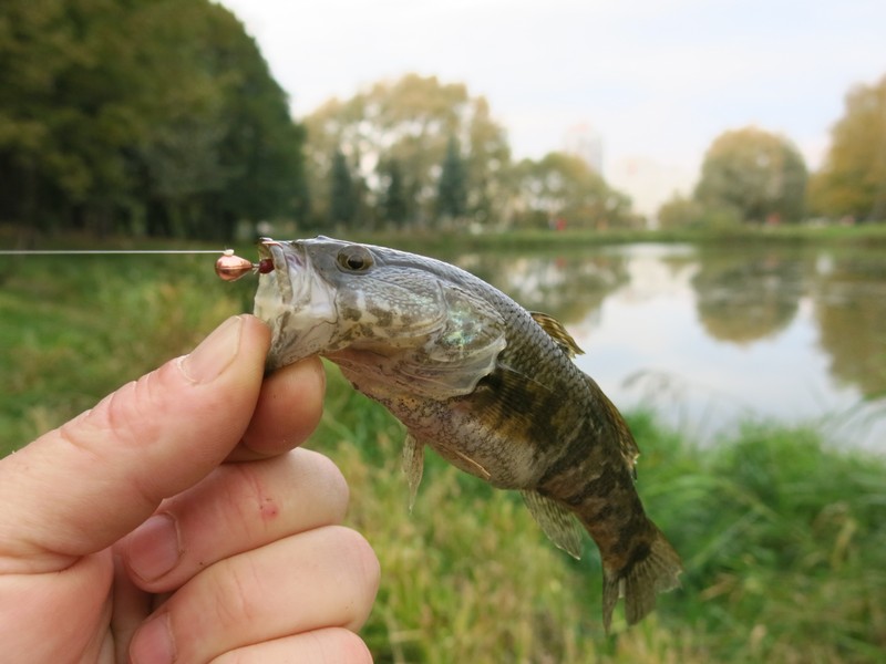 Разную рыбу я ловил по-разному. Начал с окуня – он клевал на обычной классической спиннинговой проводке. После заброса приманки опускал ее на дно, а затем вел постоянными подергиваниями – наподобие как зимой, только со льда мормышка играет горизонтально, здесь же – вертикально. Пробовал вести волочением по дну – результат был заметно хуже. Но и слишком высоко идущая приманка тоже давала меньше поклевок. Стало понятно, что для окуня нужно делать проводку у дна, но не опуская на него. Чтобы мормышка не подымалась слишком высоко, можно делать незначительные паузы, то есть вести приманку пелагически – волнообразно в толще воды.