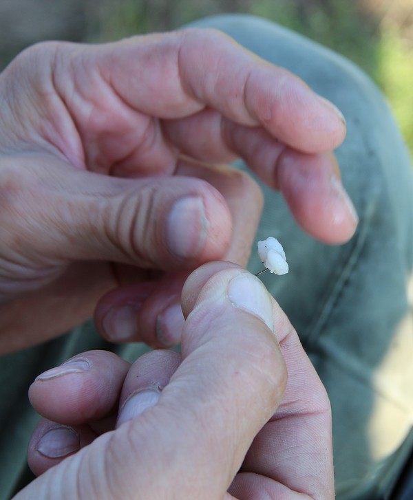 Перед тем, как насадить полимерный шарик на крючок, зажимаю его пальцами с небольшим усилием и катаю, чтобы сделать чуть мягче. Затем прокалываю насквозь, выводя жало крючка наружу. Это обязательное условие для результативной подсечки.
