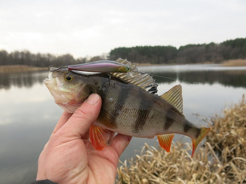 Иногда чередую мягкие приманки с некрупными воблерами, но пока этому типу приманок должного внимания не уделял. В планах в воблерки поупираться и сделать отдельную статью. Пока лишь скажу, что для воблерной ловли весеннего окуня с берега стоит подыскивать места, где не требуется дальний заброс, – эти приманки совсем «не летуны», а также с небольшим количеством или вообще отсутствием активной щуки – хищницы откусывают воблеры довольно часто. Металлический же поводок нередко портит игру приманок и ухудшает клев окуня.