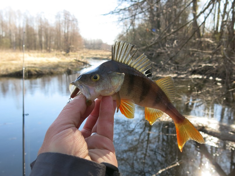 На сами реки в поиске стай полосатого хищника тоже часто захожу. Но, правда, массово ловить эту рыбу здесь не получалось: идет традиционное «топтание» берегов с облавливанием перспективных мест. Как правило, речь идет о малых реках с несильным течением. На реках покрупнее окуня получалось ловить стайно, но происходило это вовсе не весной, а летом и в начале осени. Сейчас же внимание уделяю именно малоречью, как наиболее перспективному, на мой взгляд.