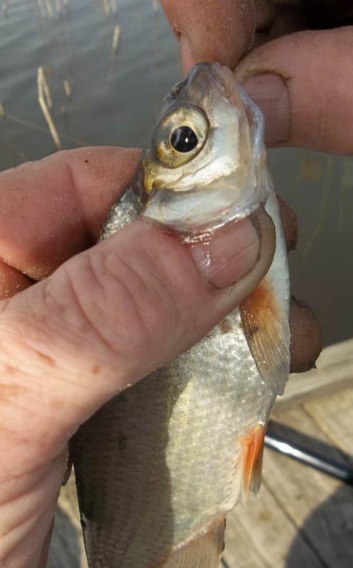 В радужные перспективы такого варианта абсолютно не верилось, поэтому с учетом безвозвратно потерянного времени мы выбрали самый простой вариант ловли, расположившись на одном из уходящих в воду деревянных мостков. Обильно раскормив одну точку метрах в десяти от оконечности настила, забросили поплавочные оснастки. Глубина оказалась порядка двух метров. Прошел час, сигнализаторы поклевок не подавали признаков жизни, и я счел затею с приводнением у второго озера напрасной. Поэтому ради шутки сложил два из трех колен самой короткой болонской удочки, уменьшил рабочий спуск поплавка, насадил на крючок пару мотылей с одним опарышем и забросил оснастку не вперед с мостка, а в сторону, где между тростниковой стены имелось окно размером не более одного-двух квадратных метров. Глубина в этой расположенной фактически под нашими ногами точке не превышала одного метра, поэтому на серьезную рыбу не рассчитывал. Разве что на мелких окуней, пескарей и уклею.