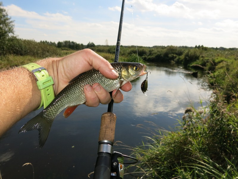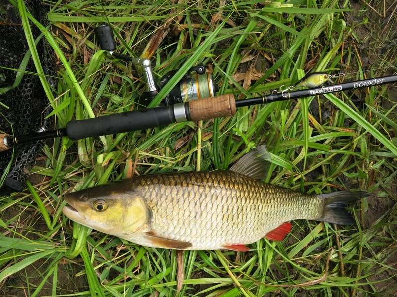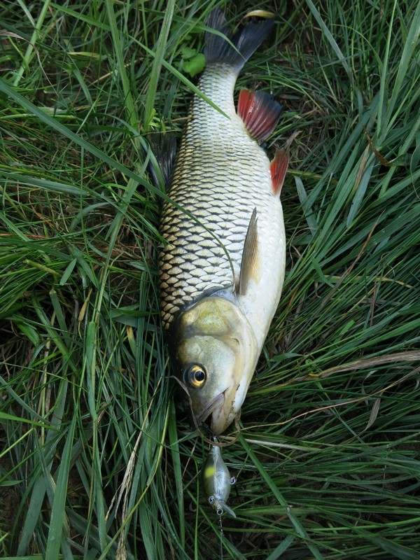 Далее в течение дня клев подзатих – самое время поэкспериментировать с приманками. Чаще всего голавля я ловлю на воблеры. Кто читает мои статьи и смотрит видео, знает, что в фаворитах у меня Salmo Tiny (плавающий или тонущий – в зависимости от ситуации), а последние сезоны открыл для себя модель Lucky John Haira Tiny, но именно мелководную версию, с полным названием Shallow Pilot 33 F. Нередко срабатывает и Jackall Chubby 38 F в версии «SR». В общем, какие-то фавориты среди воблеров давно выделились, но интересно было попробовать в хорошо знакомых местах половить голавля на вертушки.