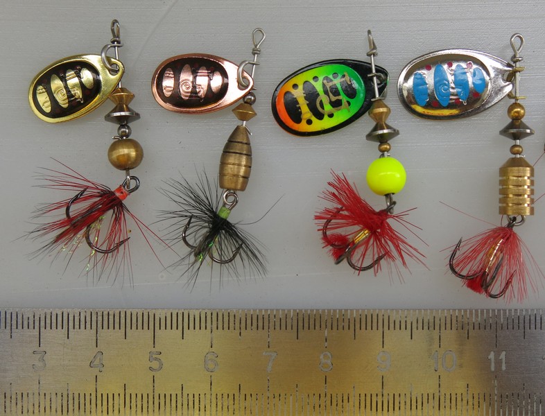 Речка маленькая и мелкая, поэтому в первую очередь пробовал небольшие размеры блесен – №0 и №1. Традиционно на реке бросаю модель с узким лепестком LJ Shelt Blade, а также универсальную Bonnie Blade – с круглым лепестком. Правда, последнюю модель мне сделали с разными сердечниками – подбираю оптимальный для стабильной игры этой блесны на течении.