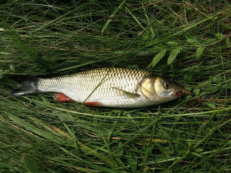 Стоило, однако, еще раз вернуться на утренние точки. Далее все по классике – сначала крался, потом полз на коленках, потом сделал первый заброс – и все произошло. Побороться, конечно, пришлось, но голавль сейчас глупый, хоть и большой – пытается спрятаться в прибрежной траве. На этот раз она была доступной – и я его благополучно вместе с «букетом» зеленки водворил в подсак. Уф! Весы показали 1550 г, а это рекорд сезона!