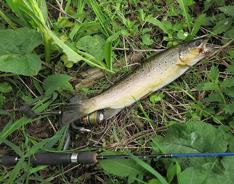 Да и вообще ультралайтовые спиннинги, как правило, короче обычных. Самый длинный в моей коллекции – 2,10 м, обычная длина – 1,8-1,9 м. Более длинные, как правило, имеют джиговую «направленность» и предназначены в первую очередь для ловли на водоемах без течения, где требуется дальний заброс. На реках, где ловлю я, он чаще всего не нужен, а условия ловли – береговой кустарник, высокая трава – и вовсе вынуждают выбирать длину минимальную, чтобы была возможность маневрировать при вываживании, а также делать забросы без риска зацепиться приманкой за ветку или растительность. Последние сезоны наиболее часто для ходовой речной ловли я пользуюсь спиннингами Team Salmo Troutino F длиной 1,83 м и тестом 1,5-7 г, а также двумя удилищами Team Salmo Powder.