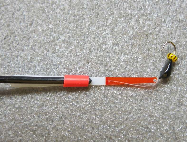 Как видите, для подготовки зимней мормышечной снасти требуется немного творчества. Готовую снасть нужно проверить, в первую очередь, на соответствие веса мормышки жесткости кивка: под ее весом сторожок должен изгибаться примерно на 45 градусов. При этом не забываем, что в воде один и тот же кивок будет сгибаться меньше, чем на воздухе, а также этот параметр будет зависеть от глубины ловли.