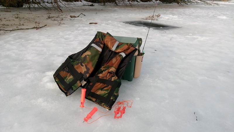 Полезным приобретением оказываются специальные костюмы-поплавки или спасательные жилеты, надетые поверх куртки. Но в ящик все равно следует положить веревку длиной 15-20 м. С ее помощью можно вытягивать человека из полыньи. Попутно мудрые рыбаки-зимники держат в герметичной упаковке средства для разведения огня (спички, сухой спирт, бумагу и т.п.). Они помогут высушить мокрую одежду при оказии, но это не означает, что запасной комплект одежды не стоит с собой брать. В машине ему место всегда найдется.