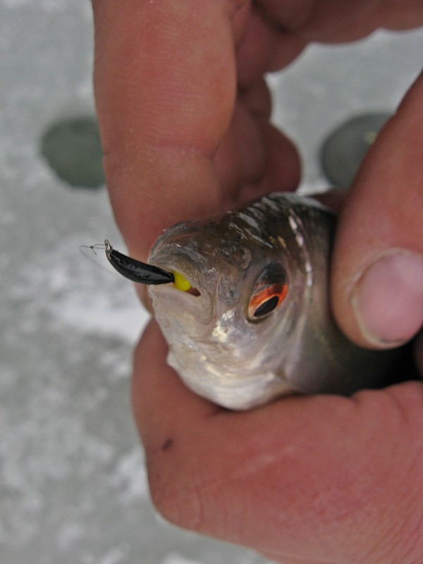 -для поимки отдельных видов рыб. Обратил внимание, что есть мормышки, обладающие удивительным эффектом. К примеру, мормышки Salmo с кристаллами. Они точно подходят для ловли и на голый крючок, и на «одетый». Причем если на пустой крючок на них здорово ловятся в основном окуни, то при наживлении мотылей мормышка становится просто универсальной. От нее начинает терять голову и плотва, и красноперка, и иная рыба;